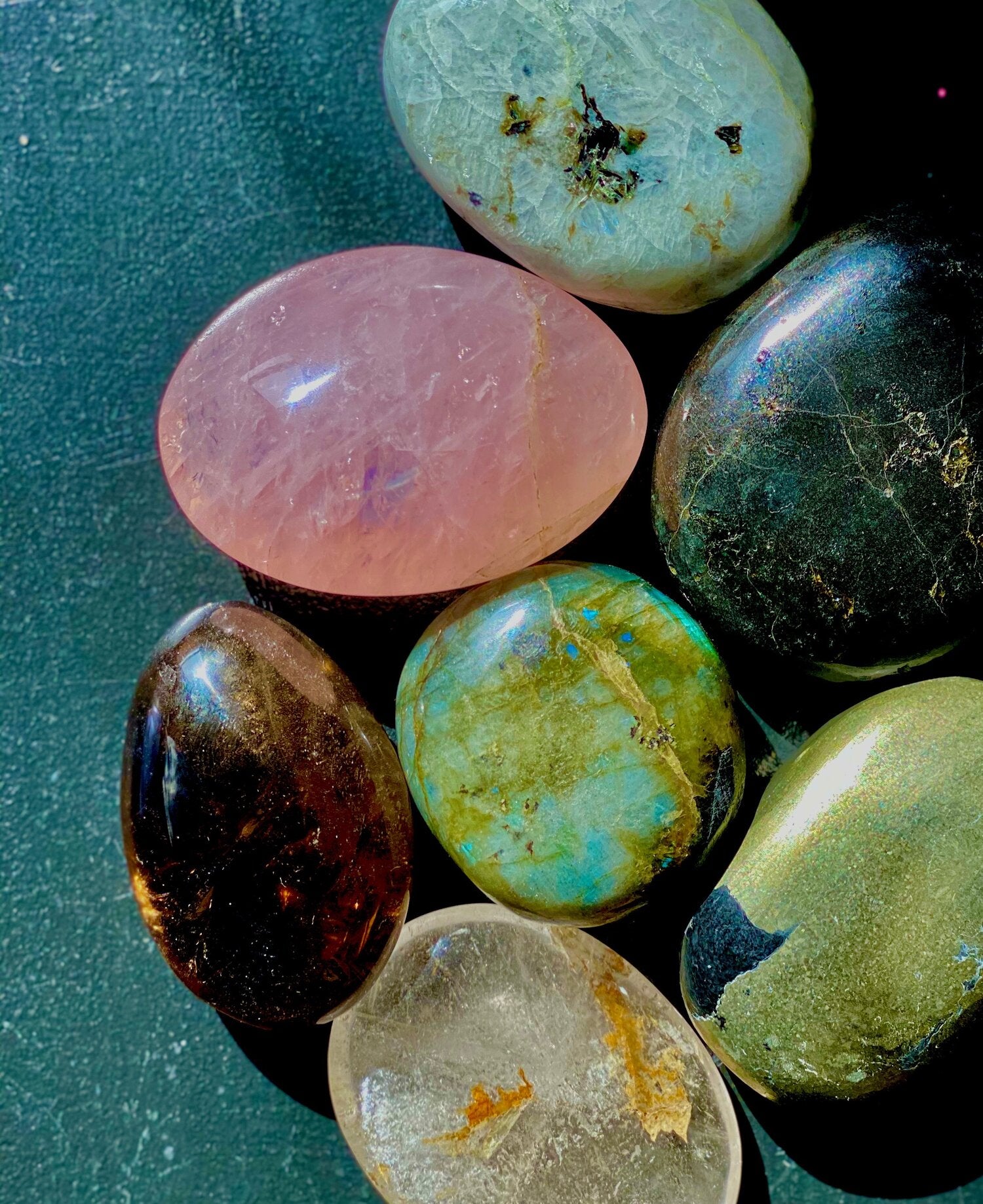 Magic in the palm of your hand: that’s the power of a palm stone. Whether you need a little extra protection or want to keep your creative energy flowing throughout the day, carrying a palm stone is an enchanting way to keep the good vibes rolling in. Please note, stones are selected at random and will not be the exact stones shown here.